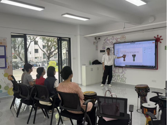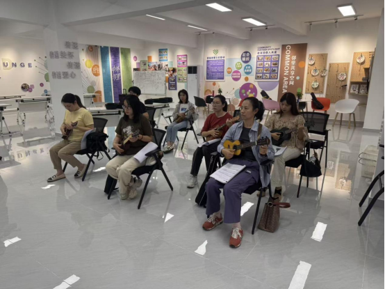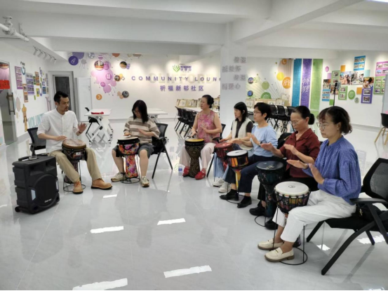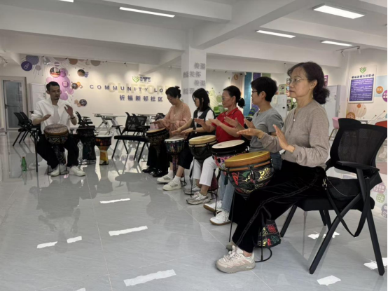 不同年龄段的居民对艺术学习怀揣着迫切渴望,这背后是大众对终身学习的热切追求:退休长辈希望在晚年生活中解锁新技能、拓展社交圈,以艺术学习丰富精神世界,让退休生活焕发别样光彩;青年群体期待在忙碌工作之余,通过艺术创作释放压力、沉淀自我,在终身学习的道路上为生活增添一抹灵动色彩。社区联动“合伙人”搭建半公益艺术平台,推出风格各异的音乐课程,让不同年龄段的居民都能充实自己。报名通道一经开启,便得到居民的热烈响应。其中,非洲鼓班以中老年居民为主,尤克里里班则吸引了众多青年职工和宝妈参与。