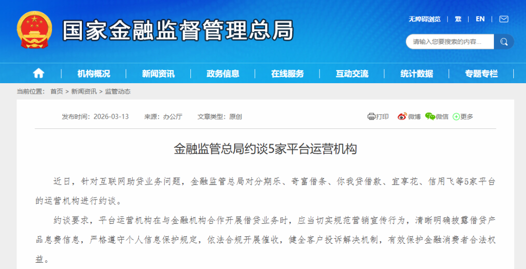 就在3月13日,金融监管总局发布通报称,针对互联网助贷业务问题,金融监管总局对分期乐、奇富借条、你我贷借款、宜享花、信用飞等5家平台的运营机构进行约谈,其背后的运营主体分别是乐信、奇富科技、嘉银科技、宜人智科、信飞科技等。