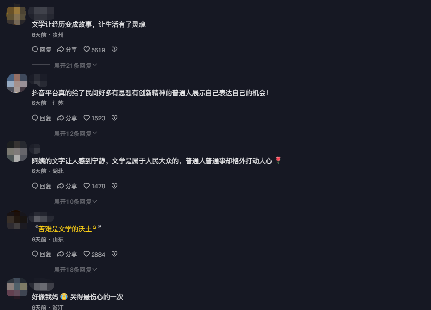 在抖音上写散文的普通人不止祝薪雁。他们大多没接受过专业的写作训练,只是写下真实的生活和感受。抖音上每天都有大量这样的内容被发布、被关注。