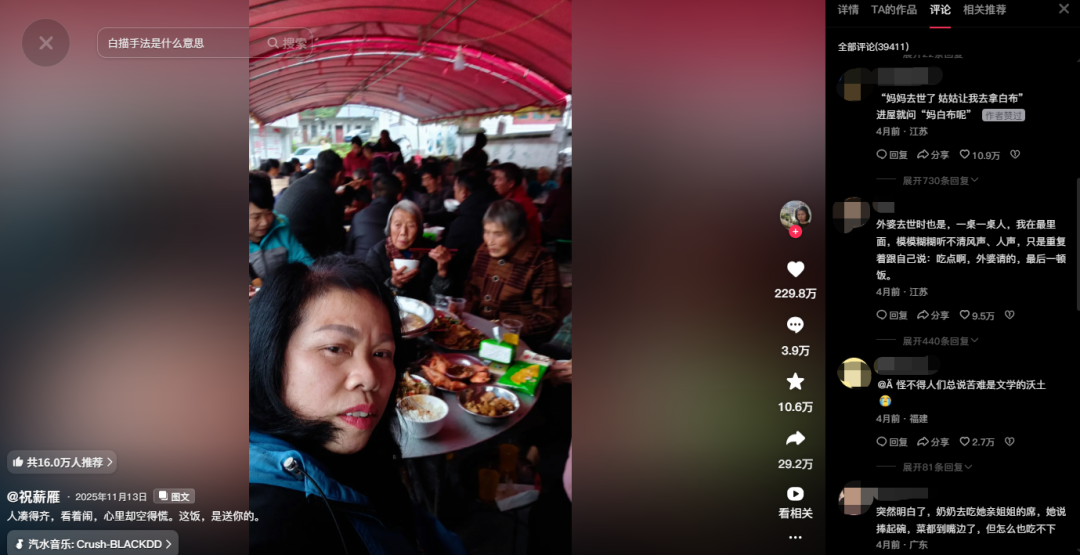 内容很简单,常常是随手拍的日常画面,配上一段文字。流传最广的或许是去年11月的那条。祝薪雁参加葬礼,饭桌前,她抬起手机拍了一张动图,画面里祝薪雁和许多嬢嬢围坐在一起,饭桌上锅气腾腾,祝薪雁写“人凑得齐,看着闹,心里却空得慌。这饭,是送你的”。